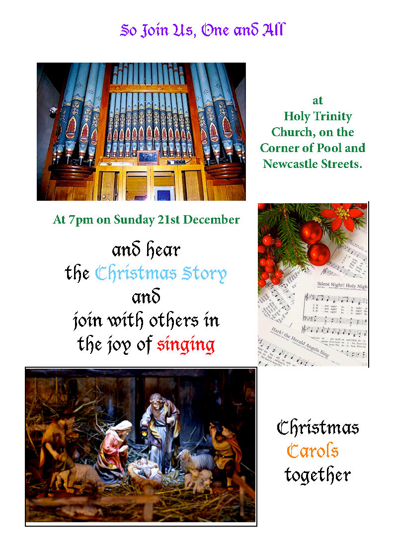 A Service of Carols and Readings for Christmas at the Holy Trinity Church, York Sunday 21st December 2025 Event Details Time: 7:00 P.M. - 9:00 P.M. Location Corner of Pool and Newcastle Streets York WA 6302 Venue Holy Trinity Anglican Church YORK Cost: Free Category: General Type: General Audience: All Ages Enquiries Contact: The Rev’d Canon Dr Philip Raymont Phone: 0419 414 021 Email: revdphilipraymont@outlook.com Website: https://visit.york.wa.gov.au/events/ Event Date(s) Sunday, 21 December 2025 | 7:00PM - 9:00PM Back to All Events