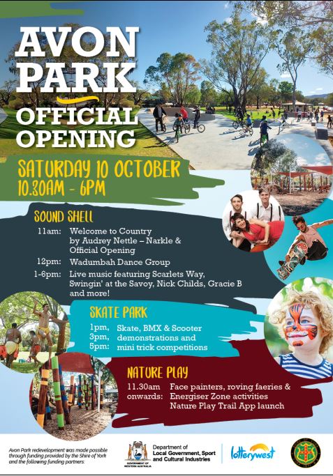 Avon Park Official Opening Past Event Official opening of the Avon Park Precinct celebrating a day of family friendly fun Event Details Time: 11am - 6pm Location Avon Park York Category: General Type: General Audience: All Ages Enquiries Contact: Shire of York Organisation: York Visitors Centre Phone: 96411301 Email: info@york.wa.gov.au Website: https://www.york.wa.gov.au/ Event Date(s) Saturday, 10 October 2020 | 11:00AM - 6:00PM Back to All Events