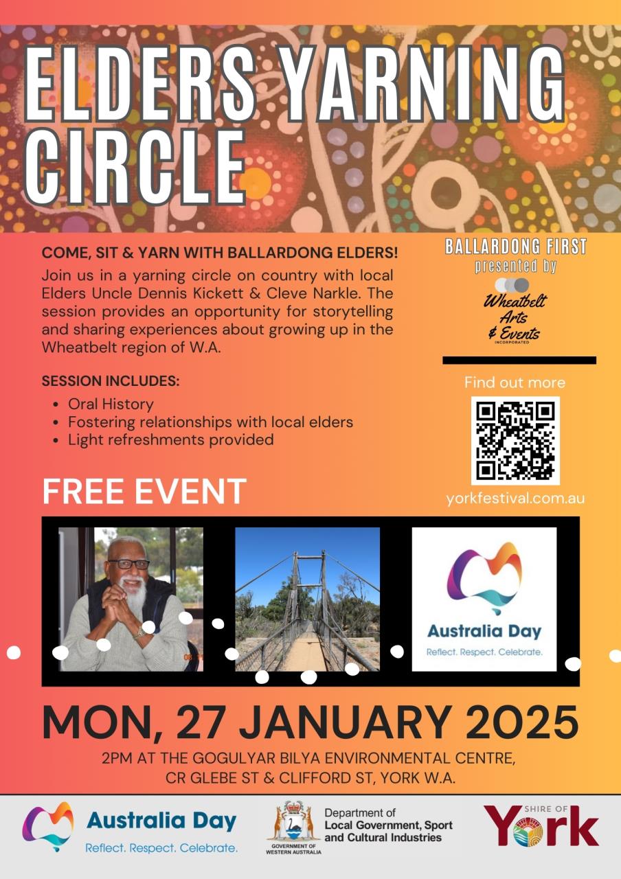 BALLARDONG FIRST 2025 - Elders Yarning Circle Past Event Event Details Time: 2:00PM to 4:00PM Location Cnr Glebe & Clifford Streets, York WA Venue River Conservation Environmental Discovery Centre Cost: Free Category: General Type: General Audience: All Ages Enquiries Organisation: Wheatbelt Arts & Events Position: Event Organiser Website: www.yorkfestival.com.au/event/elders-yarning-circle/ Event Date(s) Monday, 27 January 2025 | 2:00PM - 4:00PM Back to All Events