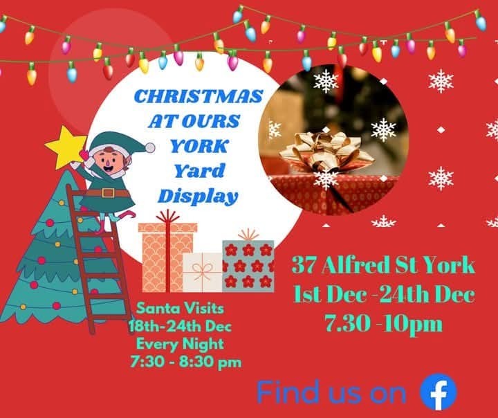 Christmas at ours York!!! Monday 1st December 2025 Event Details Time: 7:30 PM - 10:00 PM Location: 37 Alfred Street York. WA Category: General Type: General Audience: All Ages Enquiries Contact: Donna Email: peckama4@yahoo.com.au Website: https://visit.york.wa.gov.au/events/ Event Date(s) Monday 1st December 2025 Back to All Events