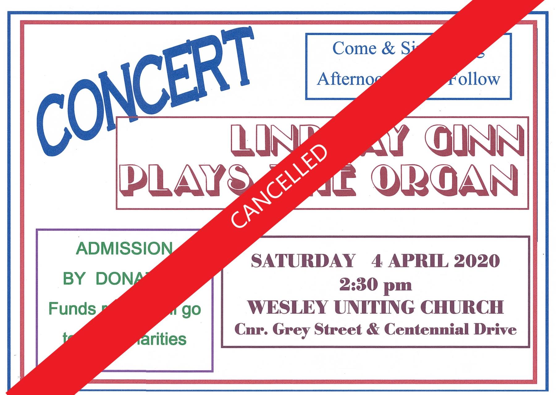 EVENT CANCELLED - Lindsay Ginn Plays The Organ Concert Past Event PLEASE NOTE this event has been cancelled. Event Details Time: 2.30pm Location Wesley Uniting Church (Cnr Grey St & Centennial Dve, York) Category: General Type: General Audience: All Ages Event Date(s) Saturday, 04 April 2020 | 2:30PM - 4:30PM Back to All Events
