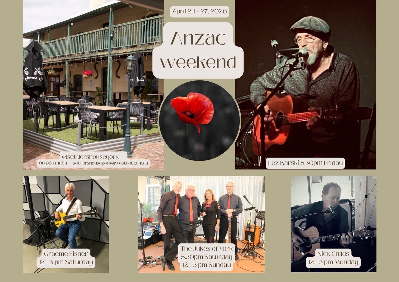 Live Entertainment all ANZAC Day Long Weekend. Friday 24th April 2026 to Monday 27th April 2026 Event Details Time: Various Address: 125 Avon Terrace, York WA Venue Settlers House Cost: Free Category: General Type: General Audience: All Ages Enquiries Organisation: Settlers House York Phone: 08 9641 1884 Email: settlershouseyork@westnet.com.au Website: https://www.facebook.com/Settlershouseyork Event Date(s) Friday, 24 April 2026 - Monday, 27 April 2026 | 5:30PM - 3:00PM Back to All Events