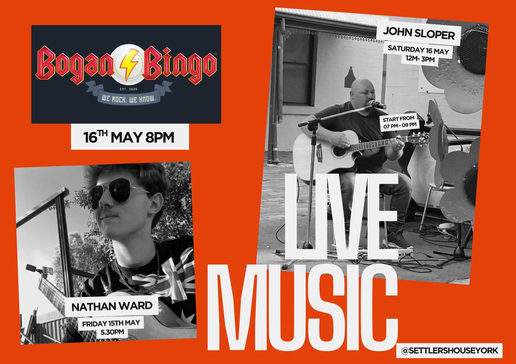 Live Entertainment & Bogan Bingo - Settlers House Friday 15th May 2026 (Multiple Dates Between Friday 15th May 2026 & Saturday 16th May 2026) Event Details Address: 125 Avon Tce York Venue Settlers House Tavern Cost: Book for Bogan Bingo Event Category: General Type: General Audience: All Ages Enquiries Contact: Stacey Slater Organisation: Settles House York Position: General Manager Phone: 08 9641 1884 Email: settlershouseyork@westnet.com.au Website: www.settlershouseyork.com.au Event Date(s) Friday, 15 May 2026 | 5:30PM - 9:00PM Saturday, 16 May 2026 | 12:00PM - 3:00PM Saturday, 16 May 2026 | 8:00PM - 11:00PM Back to All Events