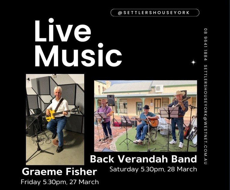 Live Entertainment at Settlers House - 27 & 28 March Friday 27th March 2026 (Multiple Dates Between Friday 27th March 2026 & Saturday 28th March 2026) Event Details Time: 5:30PM - 9:00PM Location 125 Avon Tce, York WA Venue Settlers House Cost: Free Live entertainment Category: General Type: General Audience: All Ages Enquiries Organisation: Settlers House York Position: Event Co-ordinator Phone: 08 9641 1884 Email: settlershouseyork@westnet.com.au Event Date(s) Friday, 27 March 2026 | 5:30PM - 9:00PM Saturday, 28 March 2026 | 5:30AM - 9:00PM Back to All Events