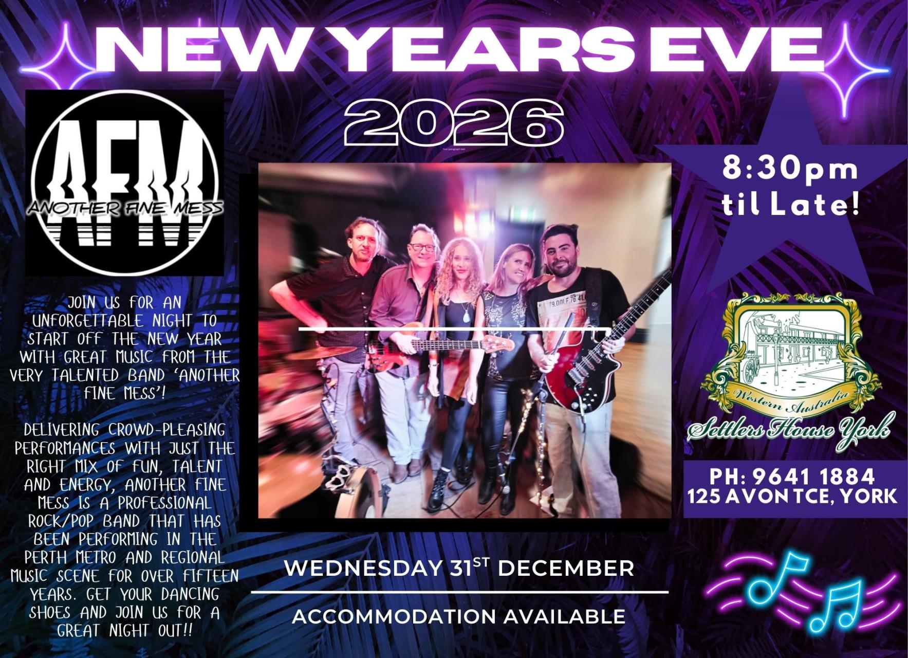 Live Music at Settlers House Wednesday 31st December 2025 Event Details Location: 125 Avon Tce York Venue: Settlers House Cost: Free Category: General Type: General Audience: All Ages Enquiries Organisation: Settlers House York Phone: 0896411884 Email: settlershouseyork@westnet.com.au Website: https://www.facebook.com/Settlershouseyork/about/ Event Date(s) Wednesday 31st December 2025 Back to All Events
