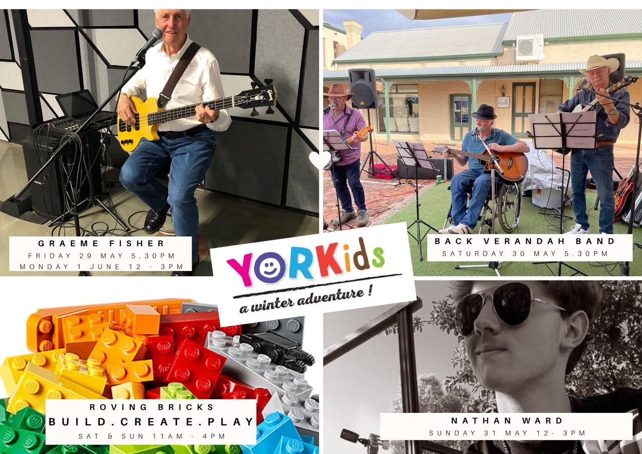 Settlers House hosts YORKids ROVING BRICKS with Live Music. Friday 29th May 2026 (Multiple Dates Between Friday 29th May 2026 & Monday 1st June 2026) Event Details Time: Various Times Address: 125 Avon Tce York Venue Settlers House Courtyard Cost: Free Category: General Type: General Audience: All Ages Enquiries Contact: Stacey Slater Organisation: Settles House York Position: General Manager Phone: 08 69641 1884 Email: settlershouseyork@westnet.com.au Website: https://www.facebook.com/Settlershouseyork Event Date(s) Friday, 29 May 2026 | 5:30PM - 8:30PM Saturday, 30 May 2026 | 5:30PM - 8:30PM Monday, 01 June 2026 | 12:00PM - 3:00PM Back to All Events