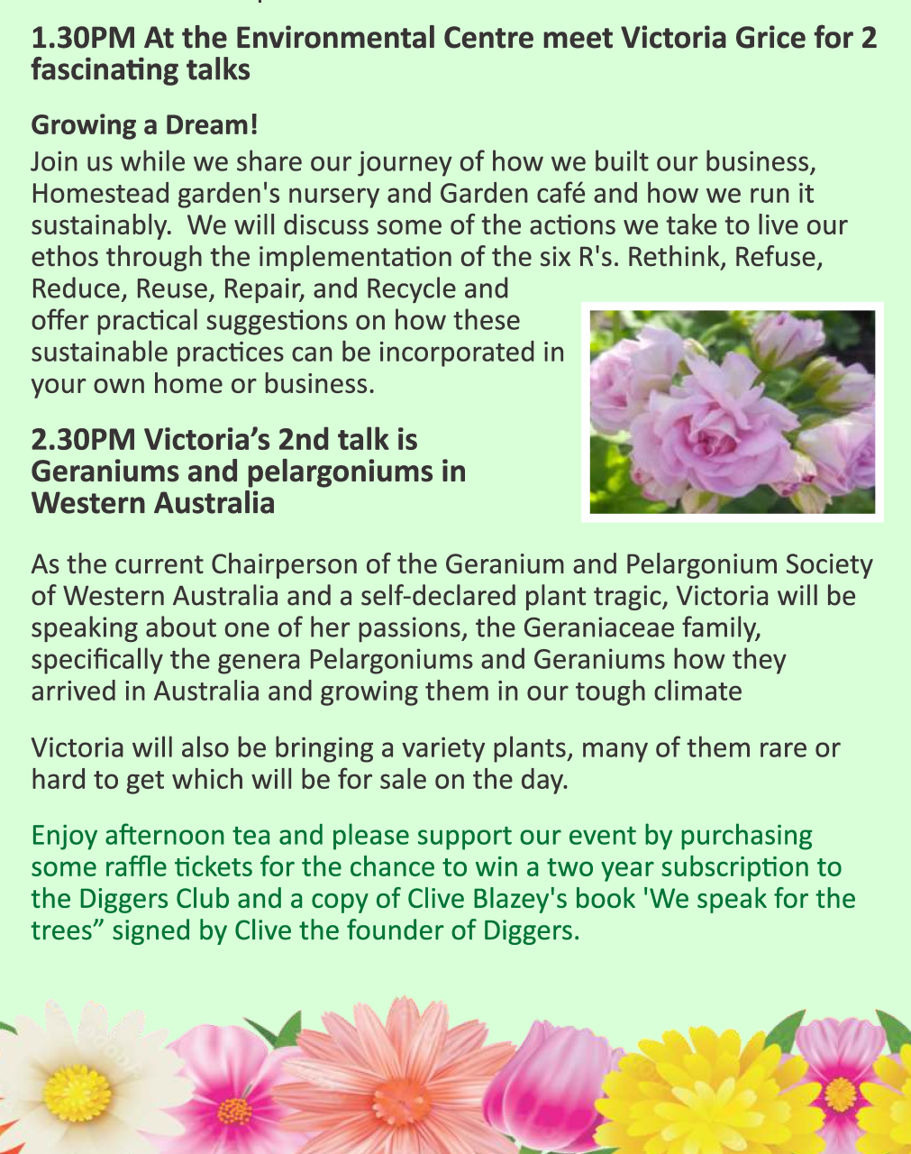 Spring into York Weekend - Victoria Grice at the Environmental Discovery Centre Past Event Pick up a full program from the York Visitor Centre at the York Town Hall. Event Details Time: 1:30PM and 2:30PM Location Glebe Street, York WA Venue Environmental Discovery Centre Cost: Gold Coin Donation Category: General Type: General Audience: All Ages Enquiries Contact: Karen Organisation: York Business Association Position: Event Organiser Phone: 0418 936 214 Email: yorkbusassoc@gmail.com Event Date(s) Saturday, 05 October 2024 | 1:30PM - 3:30PM Back to All Events