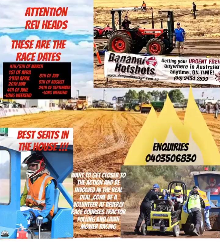 Tractor Pulling & Lawn Mower Racing Past Event WANT THE BEST SEATS IN THE HOUSE?Get closer to the action and be involved in the real deal?Come and be a volunteer at Beverley Racecourses Tractor Pulling & Lawn Mower Racing Event Details Time: 6:00 PM Location: Old Beverley Racecourse, Hamersley Street Beverley Cost: Various refer website Category: General Type: General Audience: All Ages Enquiries Organisation: Tractor Pulling and Lawn Mower Racing in WA Position: Event Coordinator Phone: 0480 295 961 Email: tractorpullwa@gmail.com Website: https://www.facebook.com/TractorWA Event Date(s) Saturday 1st April 2023 Saturday 29th April 2023 Saturday 20th May 2023 Sunday 4th June 2023 Saturday 8th July 2023 Saturday 5th August 2023 Sunday 24th September 2023 Back to All Events
