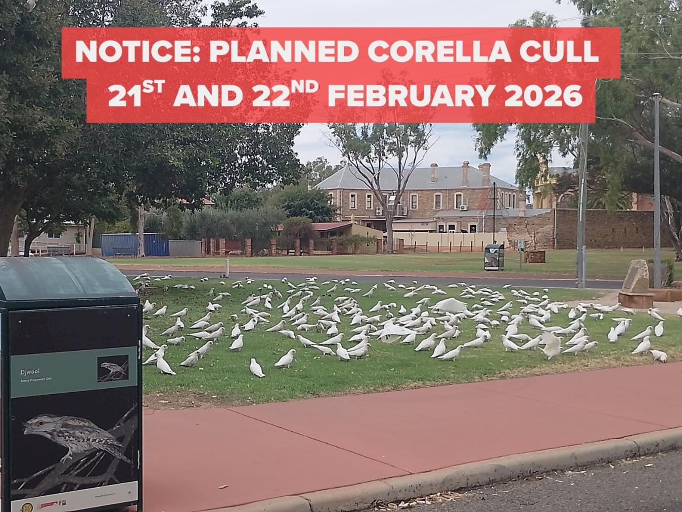 Please be aware that on the weekend of the 21 and 22 of February 2026, there will be a simultaneous corella cull across the Avon Midland Peri-Urban Partnership (AMP-UP) Shires of Victoria Plains, Goomalling, Toodyay, Northam and York.